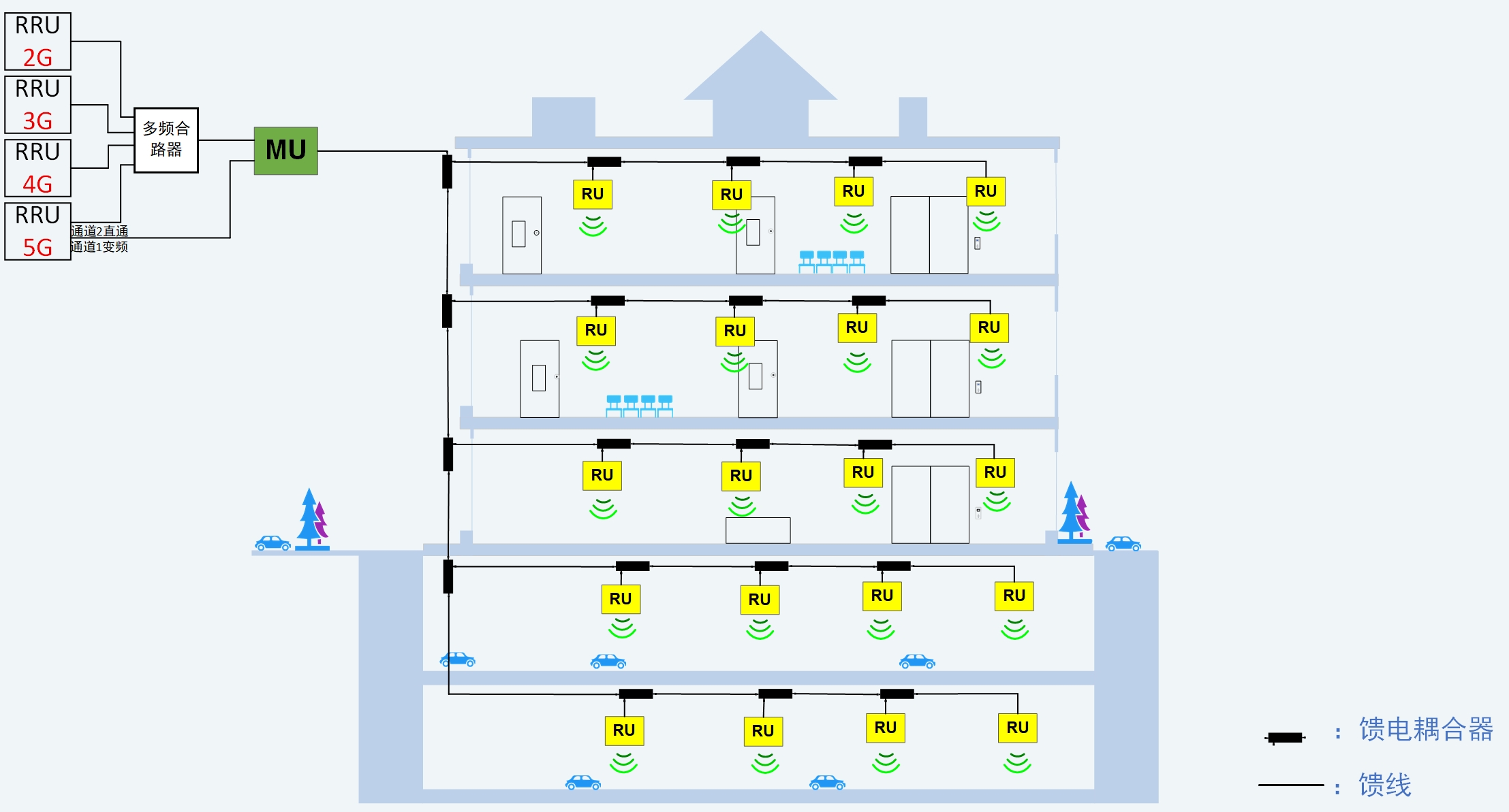 5G单路移频MIMO室分系统由主机单元(新建)、覆盖单元(更换原有天线)以及馈电耦合器(更换原有耦合器)三部分组成,主机单元将一路2.6G信号下变频并与直通路信号(非变频的2.6G以及原有2/3/4G信号)合路馈入单路室分系统,变频信号经覆盖单元处理还原为2.6G信号后与直通路信号一起进行覆盖