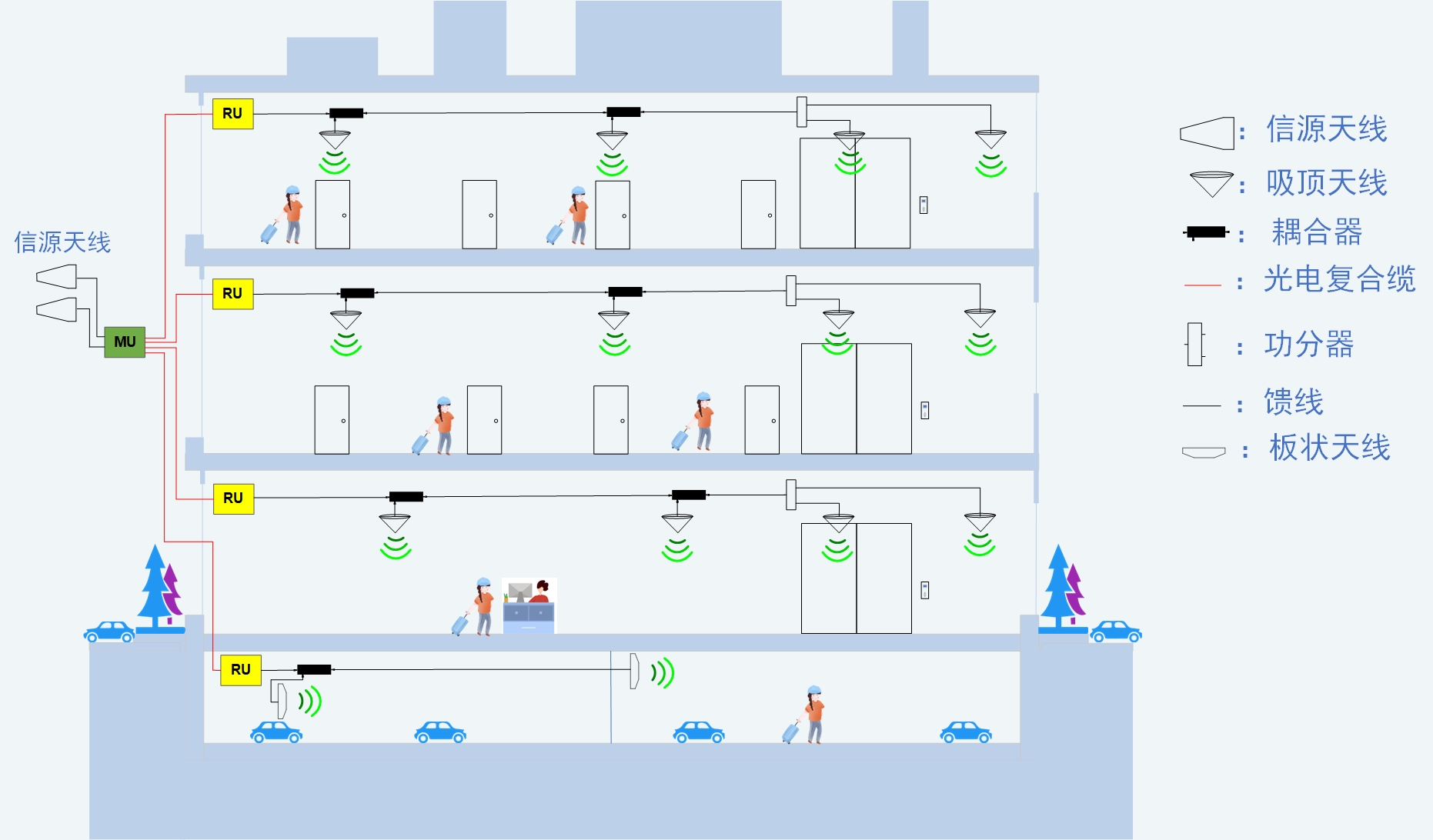中功率模拟光分布系统主要由接入单元(AU,Access Unit)和覆盖单元(RU,Remote Unit)组成。接入单元可以接收室外基站无线信号,也可以通过馈线直接耦合基站的射频信号,信号数字化处理后通过光纤传输至覆盖单元,且接入单元可以直接下联多个覆盖单元,用于快速解决低业务量的封闭盲区或弱覆盖区域的覆盖问题,是针对地下停车场、商场、酒店等类似场景的系统级解决方案。