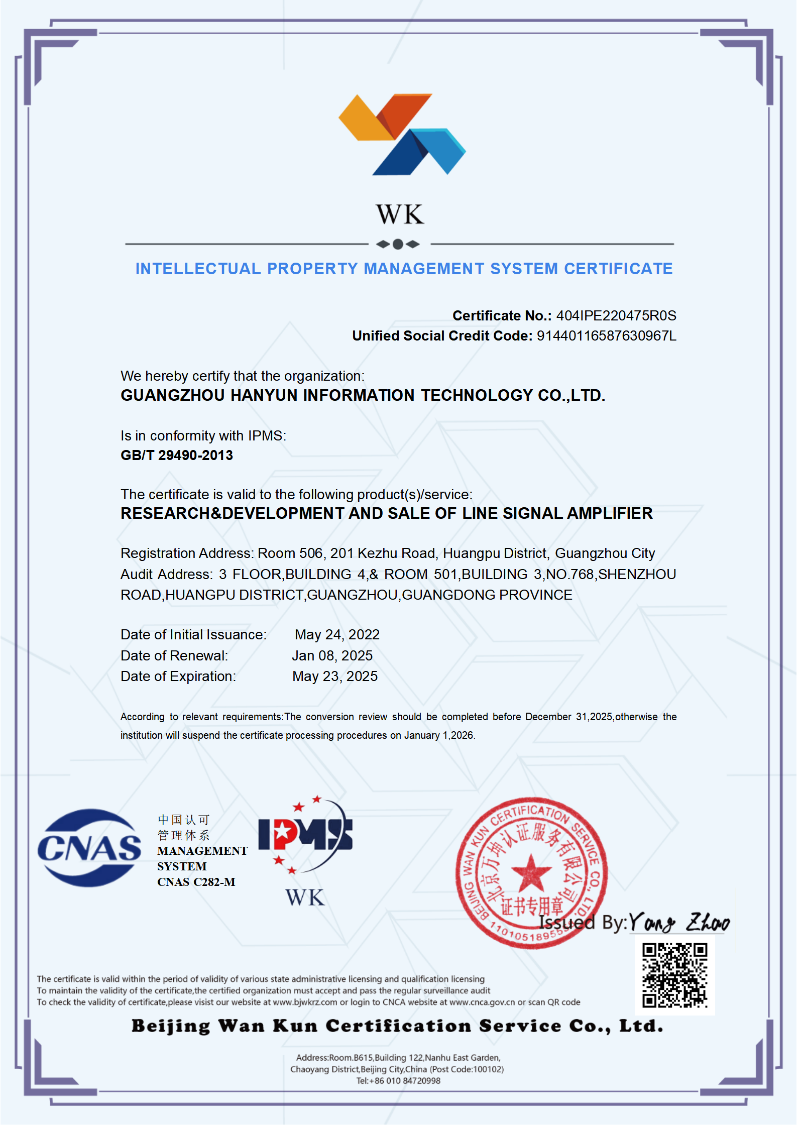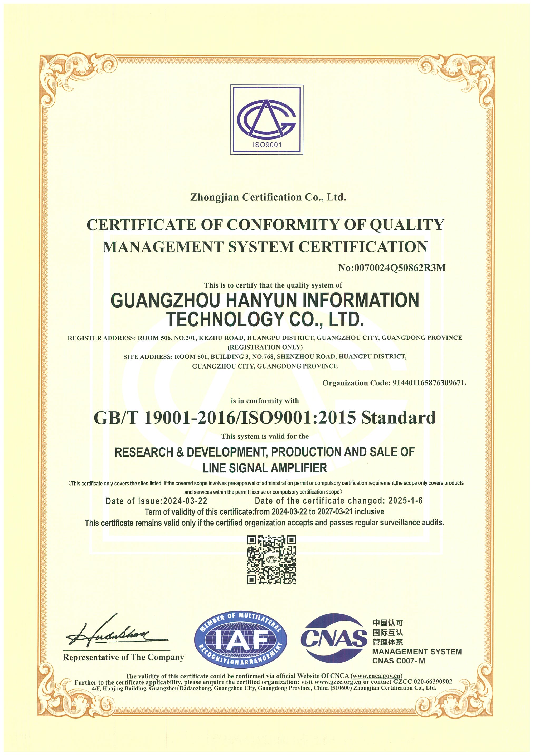 Guangzhou Hanyun Information Technology Co., Ltd., established in 2011, is a comprehensive enterprise integrating research and development, production, sales, and service. Recognized as a high-tech enterprise, a specialized and sophisticated "Little Giant" enterprise, and a gazelle enterprise, the company is dedicated to providing leading information technology solutions to domestic and international telecom operators and industry clients.Business Directions:Comprehensive solutions for wireless network optimization.Multi-system radar and phased array systems.AI-based airspace radio detection and control.Technology Platform and Intellectual Property:The company boasts industry-leading micro-power RF integration technology, beamforming technology, SDR technology, and AI algorithms, and has been awarded numerous domestic and international patents and software copyrights.Market Service Platform:With a well-established marketing and technical support team, the company possesses extensive marketing experience and a broad customer base.Enterprise Management System:The company has a robust R&D and manufacturing system and has successively obtained ISO9001, ISO14001, ISO45001, and ISO27001 certifications.Future Outlook:Committed to the advancement of information technology, the company aims to lead technological innovation and become a world-class information technology solutions provider, delivering ideal value to customers and partners.