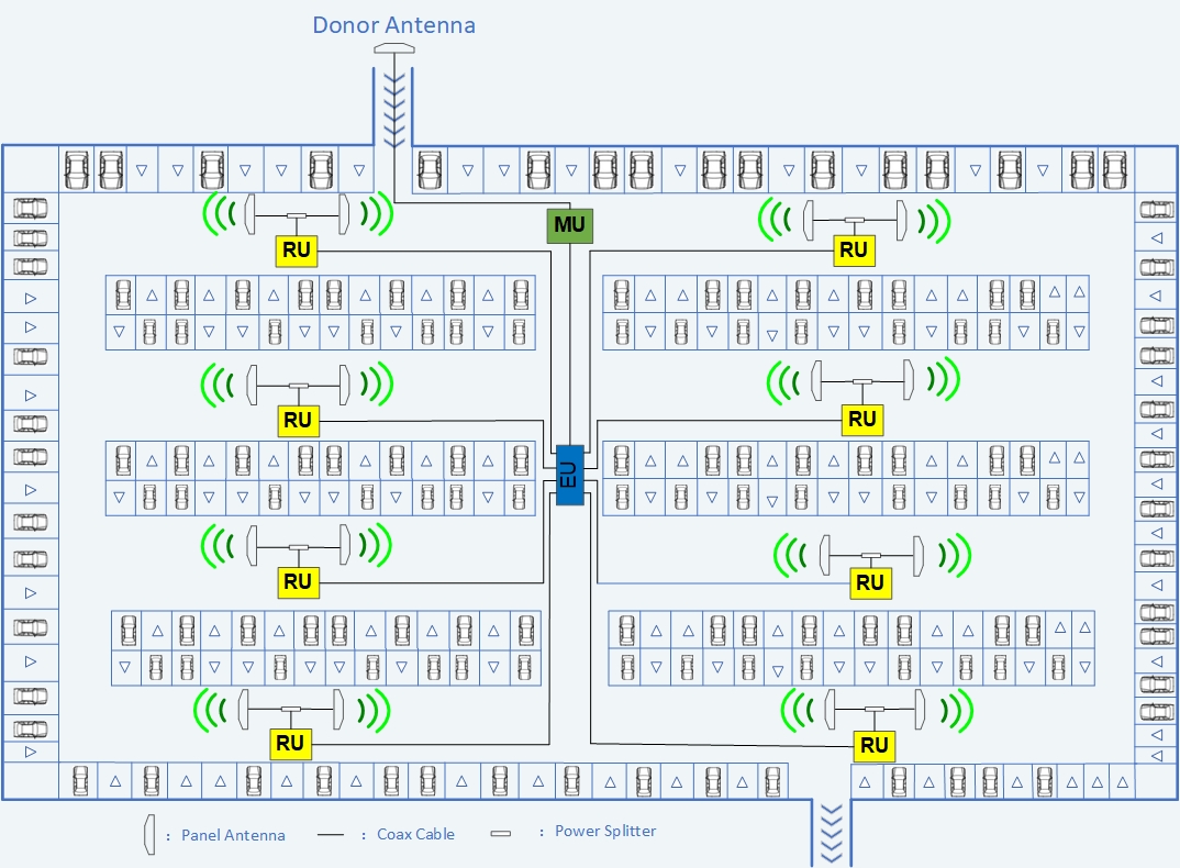 The micro distributed system consists of three-tier devices: MU, EUs, and RUs. The MU receives wireless signals from outdoor macro base stations, while the EUs connect to multiple RUs for signal extension and distributed coverage. The One-to-Eight EUs supports efficient and extended signal distribution, making it ideal for scenarios such as underground parking lots, supermarkets, entertainment venues, and ground-floor shops