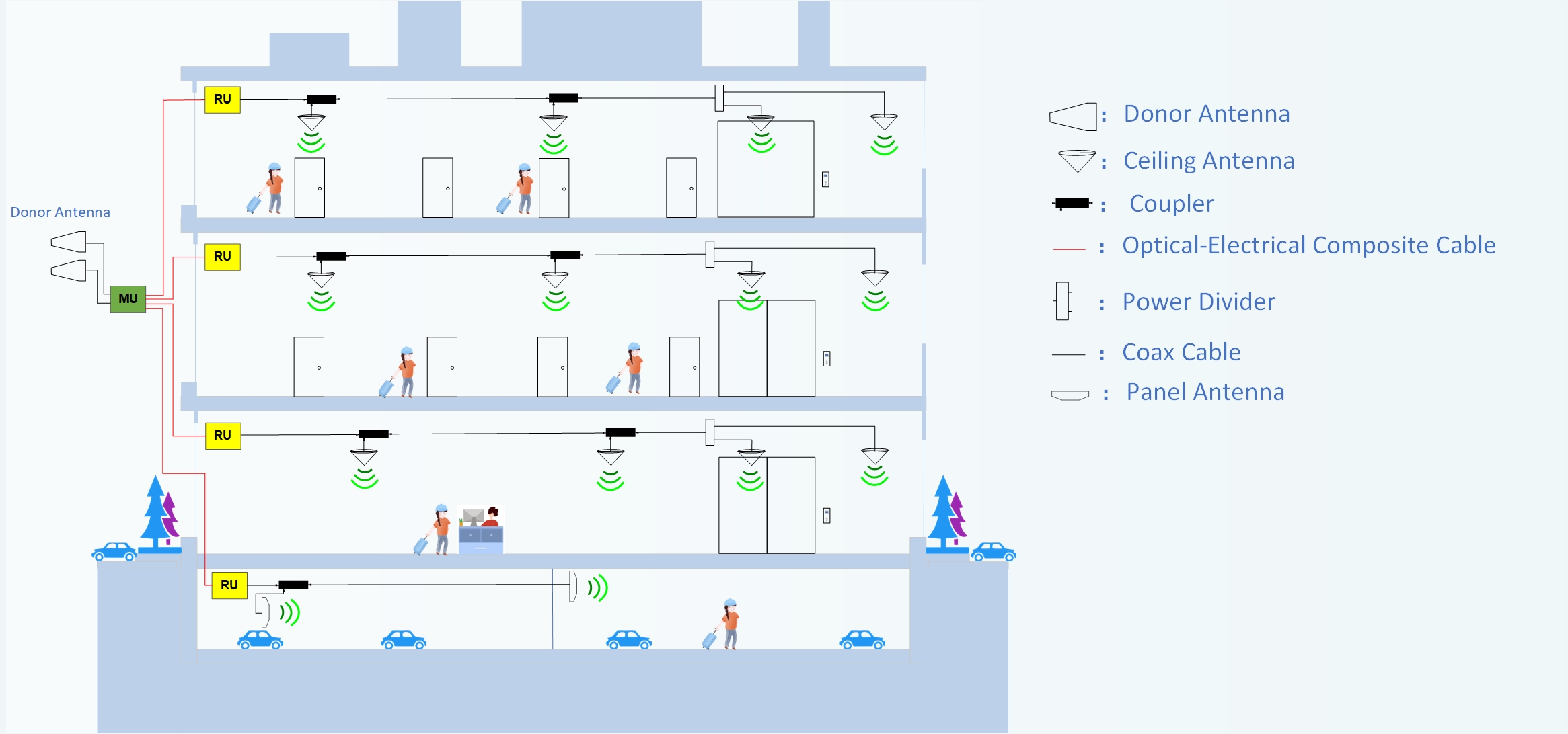 The Low-Power optical distribution system mainly consists of MU and RU. The MU can either receive wireless signals from outdoor base stations or directly couple the RF signals of base stations via a feeder. After the signals undergo digital processing, they are transmitted to the Remote Unit through optical fibers. Additionally, the MU can be directly connected to multiple Remote Units, which is used to quickly address coverage issues in enclosed blind spots or weak coverage areas with low traffic volume. It is a system-level solution designed for scenarios such as underground parking garages, shopping malls, hotels, and similar locations.