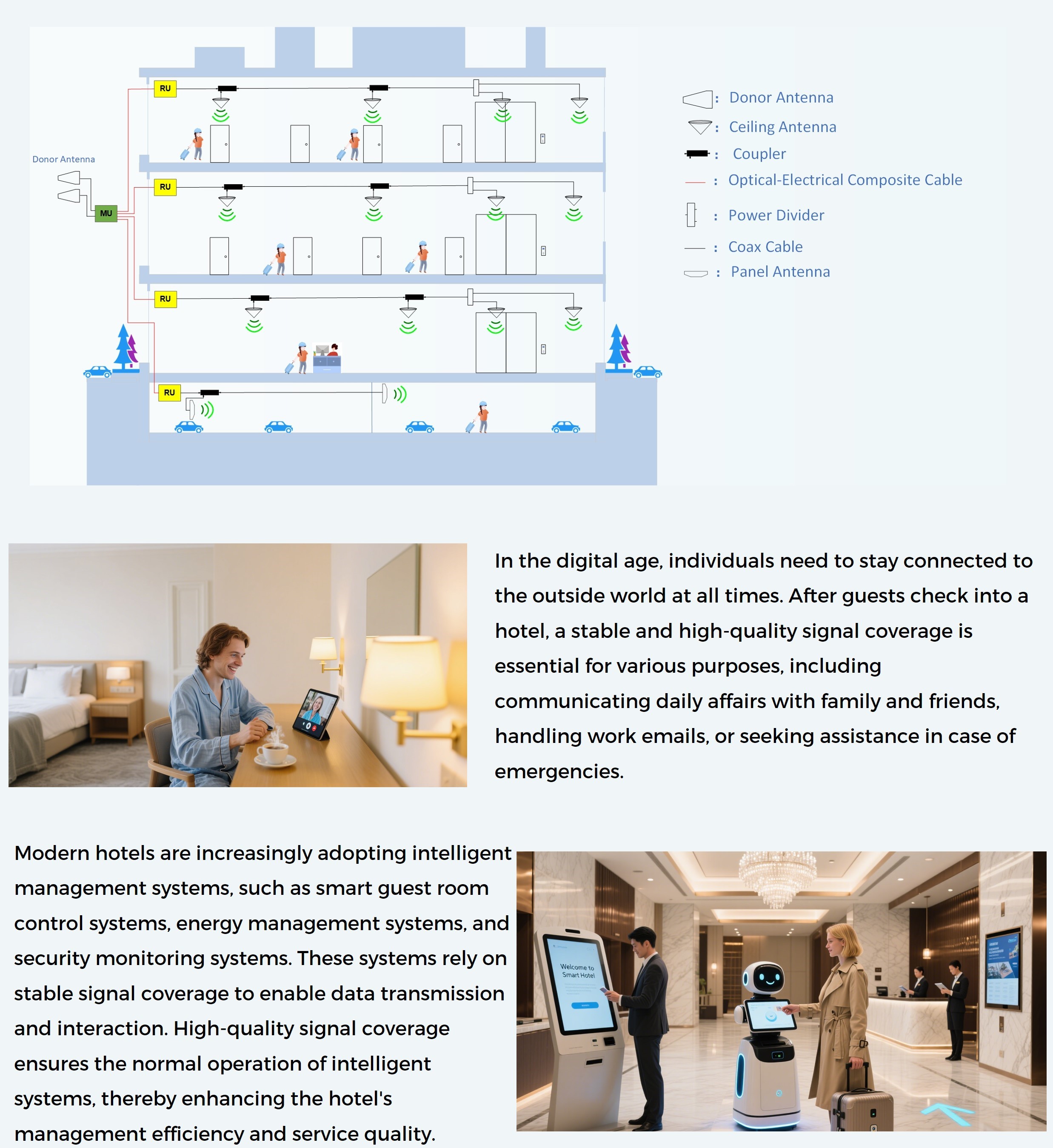 Superior signal coverage leaves a profound impression on guests. In today's era of information transparency, if a hotel suffers from poor signal quality, guests are likely to voice their complaints online, which will impair the hotel's reputation and image. The Optical Distributed Repeater is dedicated to resolving the issue of inadequate signal coverage in hotels.