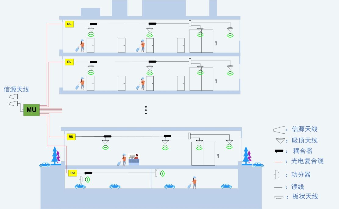 微分布模拟光分布系统主要由接入单元(AU,Access Unit)和覆盖单元(RU,Remote Unit)组成。接入单元可以接收室外基站无线信号,也可以通过馈线直接耦合基站的射频信号,信号数字化处理后通过光纤传输至覆盖单元,且接入单元可以直接下联多个覆盖单元,用于快速解决低业务量的封闭盲区或弱覆盖区域的覆盖问题,是针对地下停车场、商场、酒店等类似场景的系统级解决方案。